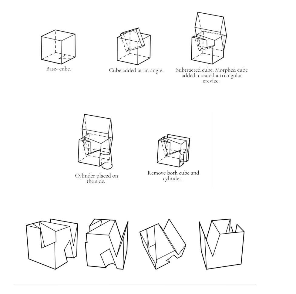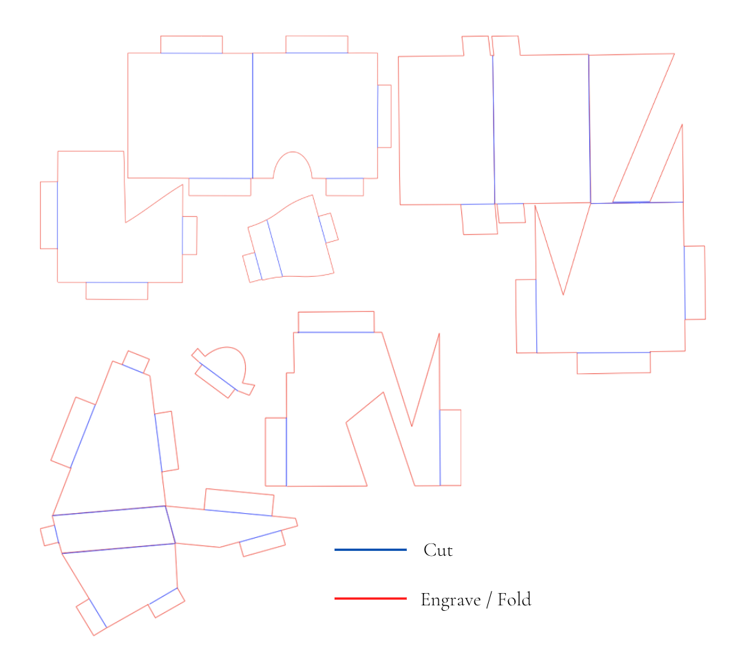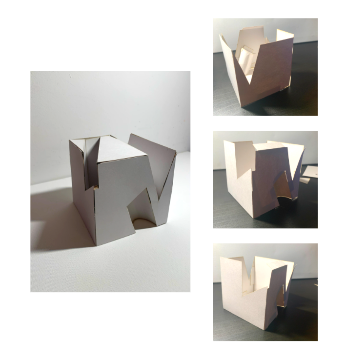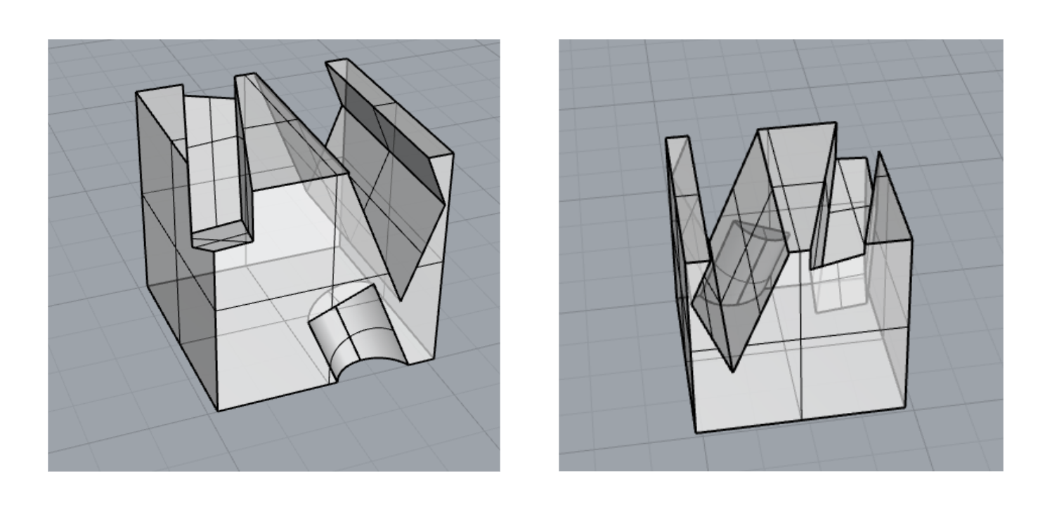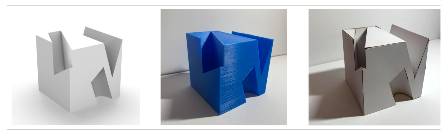 Use boolean systems to develop a 3D model (.3dm and .stl), produce a 3D-printed digitally fabricated artifact (PLA), and create 2D line drawings for laser cutting that transforms into a 3D physical artifact (card stock) through folding (tabs, adhesive, score, etc.)